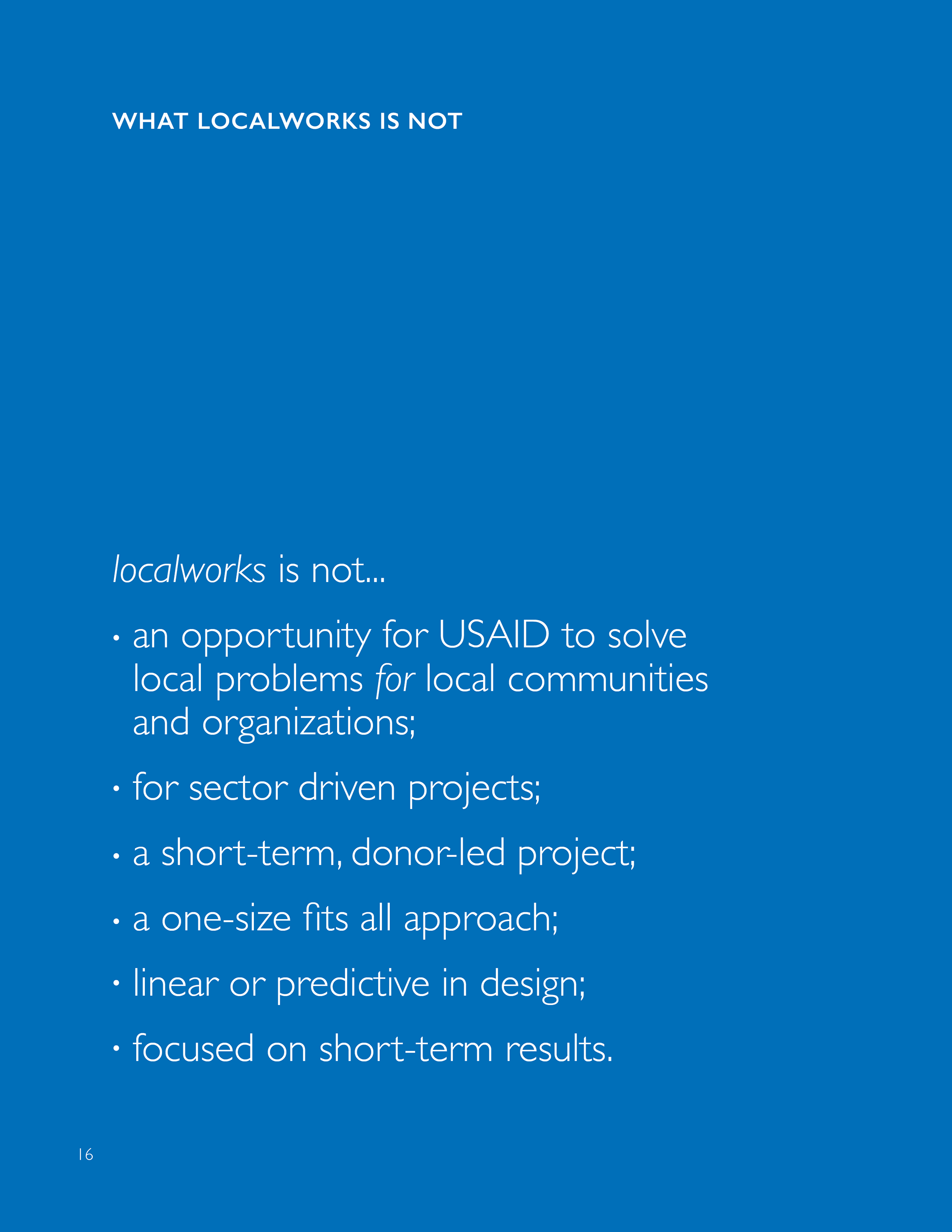 Each year, localworks competitively selects three to four USAID missions* to carry out a localworks program in their respective countries. For the 2016 round, I took the lead for drafting the main program guidance—the primary introduction to the program’s principles, philosophy, and program structure for 60+ USAID missions globally.